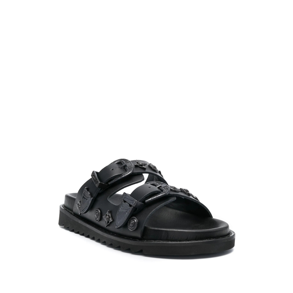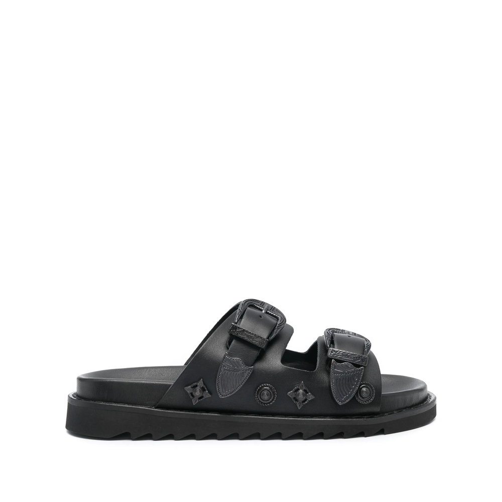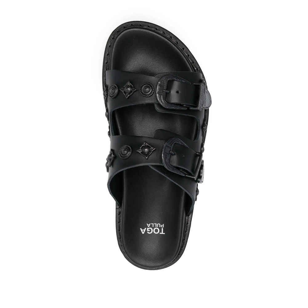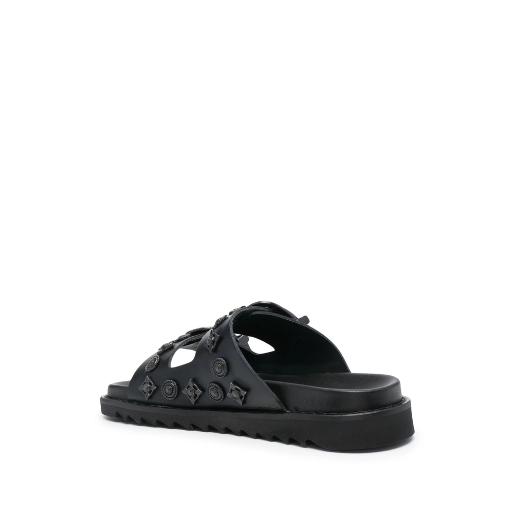 black leather tonal design stud embellishment double-strap design open toe round toe branded insole slip-on style flat rubber sole